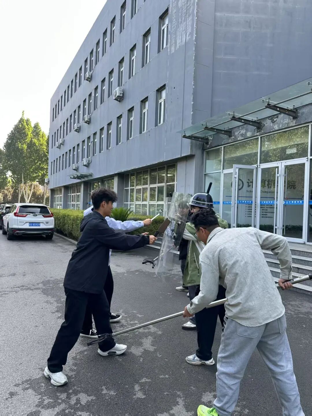 演练现场模拟“暴徒”持仿真器械冲击学院楼的场景。学院安保人员反应迅速,手持防暴盾牌、防暴叉等装备组成防御阵型,与“暴徒”周旋。他们配合默契,借盾牌格挡攻击,用防暴叉限制“暴徒”行动,最终成功制服对方。整个过程紧张有序,参演人员动作规范、处置得当,充分展现学校在反恐防暴应急处置方面的扎实基础。
