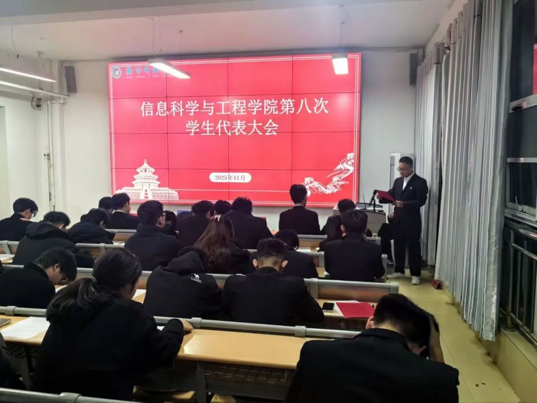 11 月 13 日,信息科学与工程学院第八次学生代表大会在昂扬热烈的氛围中圆满召开。大会以 “凝聚青年力量、共绘发展蓝图” 为核心,全面复盘上一届学生会工作成效,民主选举产生新一届学生骨干团队,精准回应学生成长诉求,为学院学生工作高质量发展注入鲜活动能。