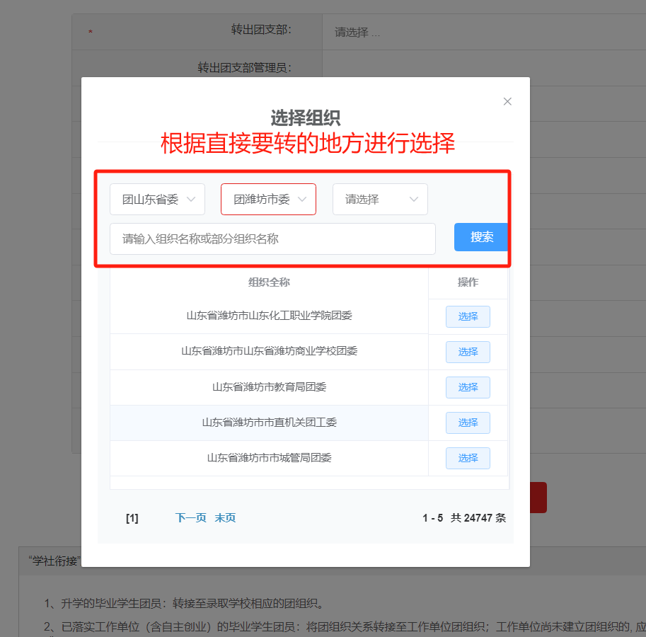 ①根据团员自身情况选择相关信息,也可以直接在搜索框中输入组织全名进行搜索。