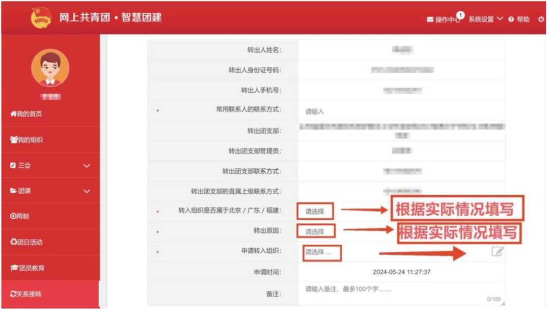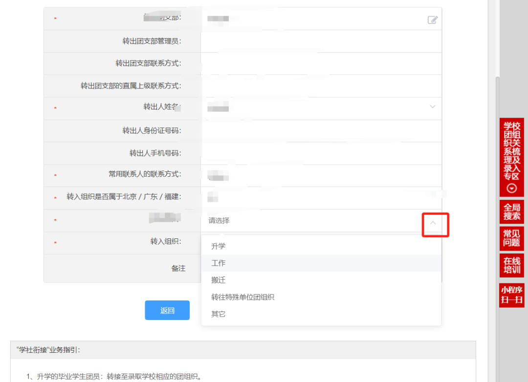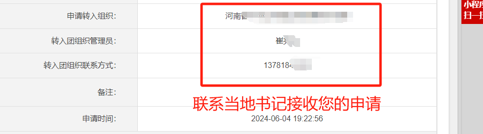 ②选择申请转入组织:转接至录取学校相应的团组织。