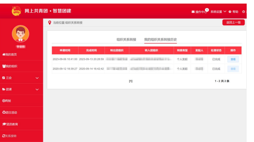 ②选择申请转入组织:将团组织关系转接至工作单位团组织。